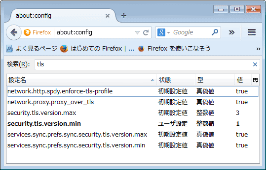 ※「security.tls.version.max」には通常、3(TLS 1.2)が初期値で設定されています。)