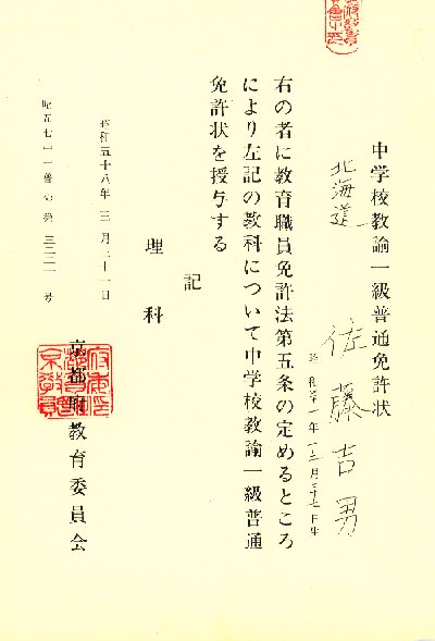 中学校理科教諭1級免許状